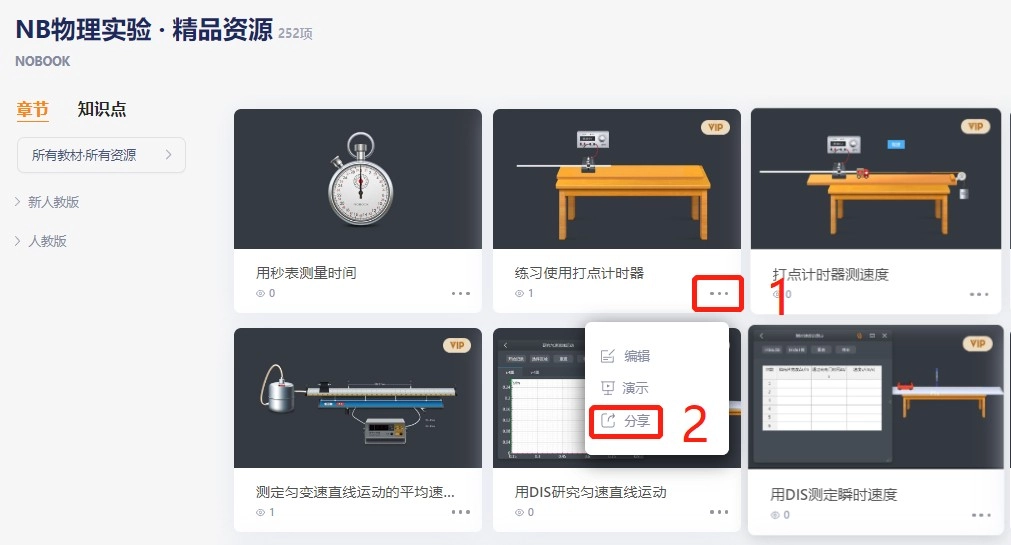 在优质资源展示区域,找到目标实验对应的更多操作按钮,点击后选择分享选项即可完成操作。