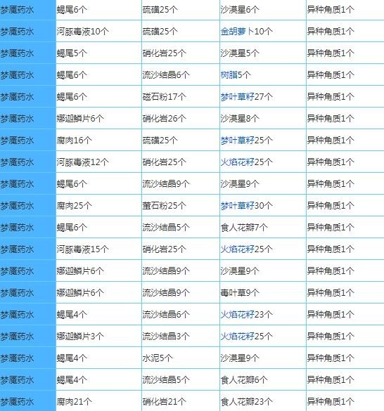 有一种特殊药水,其炼制需集齐十五片恶魔之翼、二十五份辉夜矿、二十五颗雨栗果,以及一滴凋零眼泪。