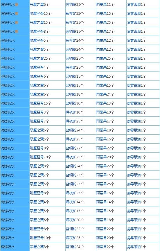 魂铸药水的配方如下:需要恶魔之翼6个、蓝铜粉25个、雨栗果11个以及凋零眼泪1个。
