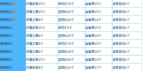黑暗药剂:15片恶魔之翼、25份蓝铜粉、15颗幽冥果、1滴凋零眼泪