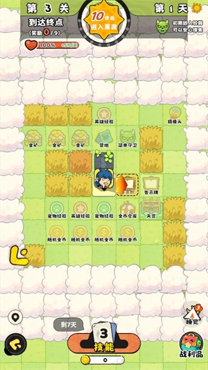 在白天,玩家可以挑选3个技能来提升自身能力;到了夜晚,就会遭遇更为强大的敌人。