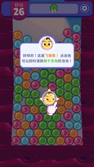 上方带有数量和颜色标识的泡泡,是玩家需要完成的任务目标;而下方的小鸟,则是能够提供强大助力的道具。