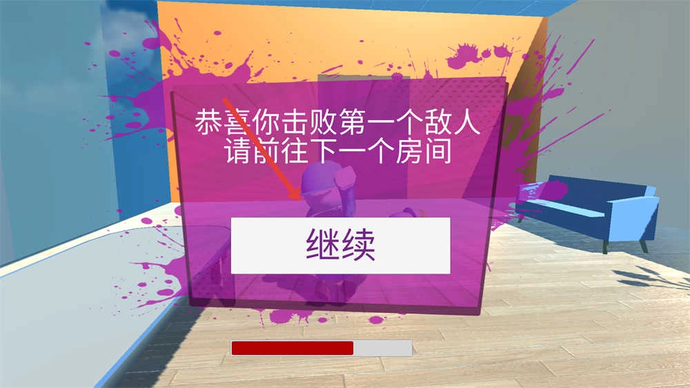 成功战胜敌人后,会弹出提示前往下一个房间的界面,点击继续按钮,即可进入下一个房间继续进行游戏。
