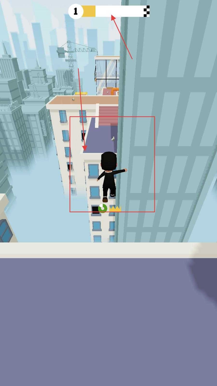 在城市楼宇间穿梭攀爬,要持续操控角色移动,达成关卡进度条的目标要求,留意避开各类障碍物,从而顺利通过关卡。