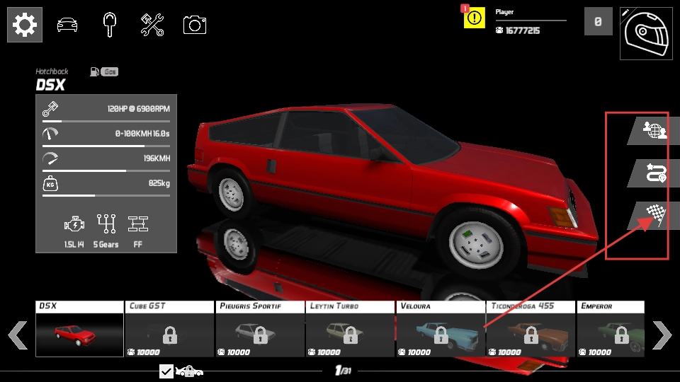 进入游戏主界面后,一辆酷炫的红色赛车映入眼帘,挑选下方自己心仪的赛车,准备开启一场惊险刺激的比赛。