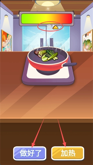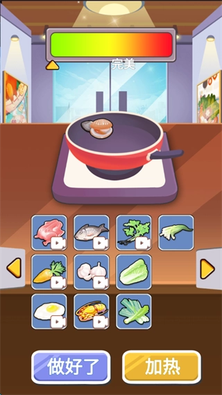 长按右下角的加热按钮来调节火候,留意屏幕上方的“完美”指针,尽可能让指针停留在完美区域,这样就能得到最佳效果,操作完成后点击“做好了”提交菜品。