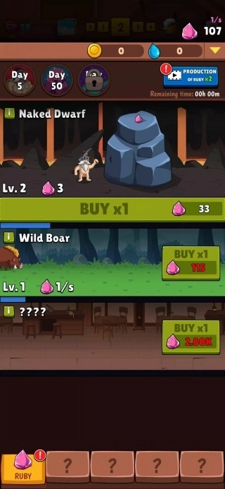 2、玩家可以通过手动点击或系统自动放置的方式获取红宝石,利用这些红宝石解锁矮人矿工的生产线,以此构建起稳定的经济体系。在资源不断积累的过程中,再逐步丰富和壮大英雄阵容。