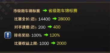 这里要说明的是,赛事中心升级肯定是最划算的,但升级会增加赛事难度。如果玩家的座驾实力不够,升级后反而可能因为排名下滑导致收益降低。所以建议在确保能拿下当前赛事第一名之后,再进行下一级的升级。