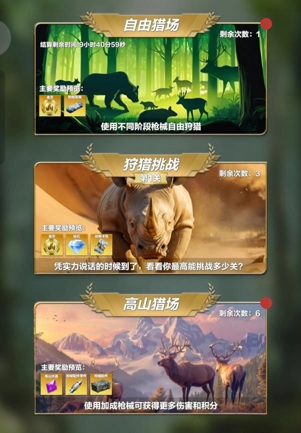 其中自由狩猎场,共有四个阶段,需使用适合当前阶段的枪械进行自由狩猎,例如在一阶自由狩猎场,仅限使用1阶枪械狩猎,以此类推。每次进入并完成狩猎后,都将获得枪械碎片等资源作为结算奖励。