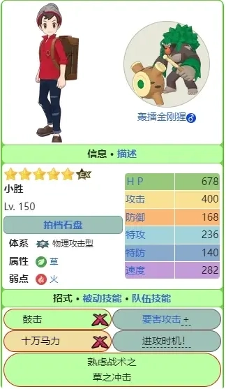 小胜&轰擂金刚猩:作为草属性的输出手,它具备强劲的“破防”能力,效果直白且极具冲击力。不过它和多数攻击型输出一样,存在四格气槽的问题,卡气时确实让人头疼。但纵观草系卡池,强势又好用的角色不算多,简单粗暴的攻击型草系更是稀缺,蜥蜴王大概是其中表现最好的。轰擂金刚猩本身也不错,不过一宝时更需注意手感,这时候搭配提速辅助,借助它的被动破防效果,伤害表现不会差。推荐指数:三颗星