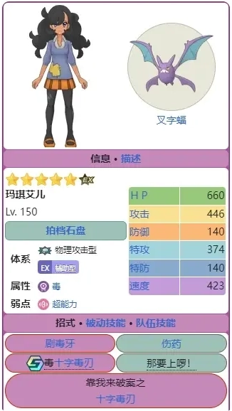 玛琪艾儿定位是毒系打手。我个人觉得它其实挺强的,一宝就能用。它的BUFF虽然没法把自身攻击拉满,但可以给全队提升四级速度。同步技能威力大,不过要四格气槽才能用,但它被动有50%概率让同步零消耗释放,再加上全队加四级速度能加快攒气,气槽的问题基本能解决。最大的短板是毒牙只有50%的中毒几率,没中毒的话同步技能就用不了,所以最好搭配能上中毒的队友一起用。不过普池里还有不良蛙这个优秀的毒属性打手,一宝的玛琪艾儿虽然能用,但我不太建议自选它。推荐指数:两颗星。