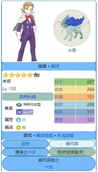 水京&水君:强力的水系输出角色。实际上水君表现挺出色的,能一键叠满增益效果,固定的输出流程是先上增益→再上束缚→接着直接用同步冲浪,同步冲浪即使攻击多个目标威力也不会降低,甚至有20%的概率造成畏缩效果,而且攻击多目标还能加速回气。它唯一的不足是基础能力数值偏低,140级时特攻还不到300,不过整体来看还是不错的,哪怕是一宝也能凑合用,但由于水系里有不少更优秀的低阶角色,所以水君的优先培养等级不会太高。推荐指数:三颗星