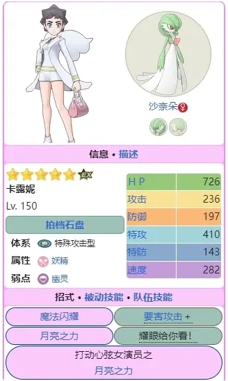 卡露妮与沙奈朵:作为妖精系的老牌输出手,妖精系长期以来都缺乏顶尖强者。不过今年玛机雅娜登场后,其他妖精系宝可梦和它的实力差距被拉得很大。主打攻击的沙奈朵自然也就没什么出场优先级了。虽说它的被动能提升招式威力,但受限于mega形态的拍招机制,输出能力其实相当低。要是你没抽到玛机雅娜,我更建议你考虑抽妮莫的吼叫尾,而非自选沙奈朵。推荐指数:★