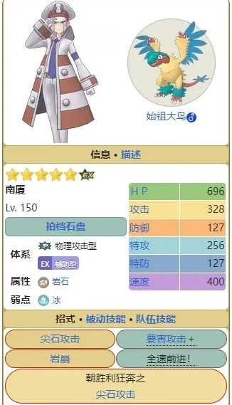 南厦&始祖大鸟:作为老牌岩石系输出手,它和不少同类型宝可梦一样存在卡气的问题,但和其他卡气选手相比,始祖大鸟的伤害表现还算不错——毕竟在它活跃的时期,岩石系强者确实不多(现在的情况已经不同了)。始祖大鸟对沙暴环境的依赖度较高,通常会和搭档北尚的龙头地鼠配合登场;此外,它的招式能触发畏缩效果,但提升畏缩几率的关键效果在三宝石盘里,自选玩家拿到一宝时手感会非常糟糕,再加上它自身基础属性数值偏低,不太建议自选获取。推荐指数:一颗星