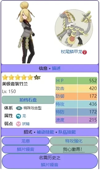 竹兰&杖尾鳞甲龙作为老牌龙系选手,扩盘后解决了之前BUFF效果较差的问题,但我认为它最核心的痛点依旧是气槽极易卡顿——这一点和捷克罗姆类似,即便鳞甲龙叠满6层速度,释放四格气槽的招式时还是会出现卡气情况,追根究底还是速度值过低,二者都只有200左右,根本支撑不了四格气槽招式的消耗。目前只有五宝鳞甲龙能凭借专属石盘实现零消耗,推测DENA在设计四五宝盘时,正是考虑到卡气槽的问题才为五宝配置了零消耗机制。再加上如今龙系新秀辈出,不太建议通过自选获取。推荐指数:★