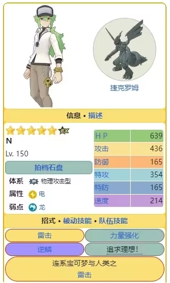 N&捷克罗姆作为老牌电系输出手,拥有游戏中少见的无视减伤破防被动,但自身增益效果较差,非常依赖队友补充CT。尽管被动包含两个零消耗效果,可连续释放四次气槽的“雷击”后,还是容易出现卡气情况。我分析原因在于捷克罗姆140级时速度仅200左右,数值过低导致后续气槽供应不足。此外,它是群星盛典池每月可能随机出现的沙龙拍组,不建议为解锁沙龙而在此自选——沙龙拍组无法提升战力,且配套的象征鸟多用于传说连战,需要反复凹闪避,普通玩家基本用不上。因此,捷克罗姆也不是自选的推荐选项,推荐指数为一颗星。