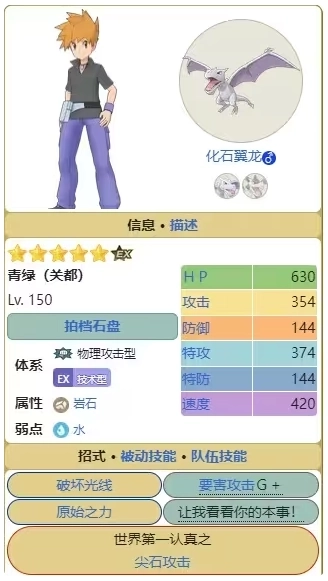 青绿&化石翼龙作为老牌岩石系输出手,和赤红喷火龙有着不少相似的问题。首先是它的增益链过长,而且强化后自身双防会下降,导致生存能力堪忧;其次受mega机制影响,未mega时输出能力弱,且关键的提速增益必须在mega进化后才能生效,整体操作门槛很高。不过它也有一个亮点——加暴击的增益效果是全队共享的,能为队友补充暴击率。我一般会在传说冒险的连战中把它当炮灰,上场给队友挂完暴击buff就阵亡。综合来看不太推荐自选,推荐指数:★