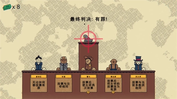 你可以这样理解:当场上没有其他参与者时,大众最终得出的结果其实就是法庭期望的结果(这结果有时可能并非你所希望的,比如在最后一关你作为被告的情况下,但法庭的诉求始终是让真正的罪人被判定有罪)。所以,秉持民主理念的人会顺应法庭的倾向投有罪票,而带有厌世情绪的人则会做出相反的选择。