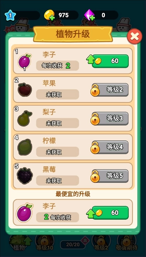 4、花费金币升级植物,更好的去经营你的农场。