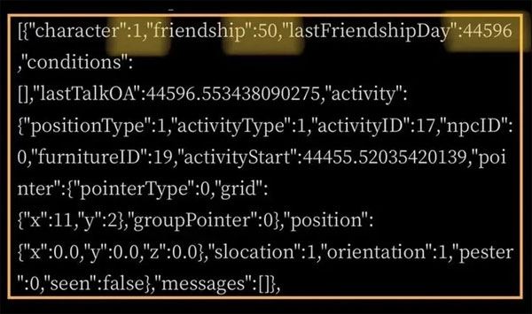当你见过目前所有的17个NPC后,在你复制粘贴出来的存档里,就能看到这样19份关于NPC的存档信息: