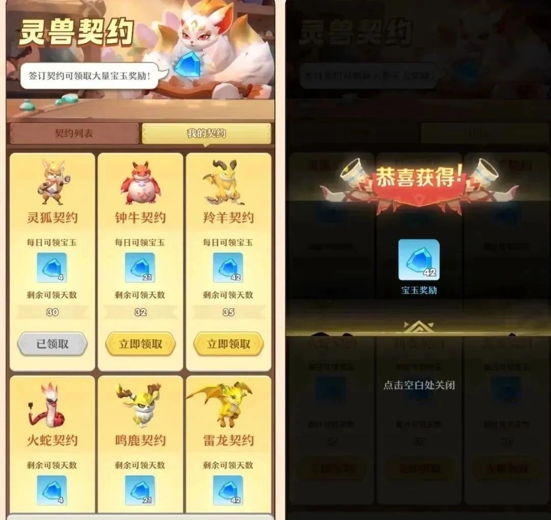 玩家在游戏里能通过多种方式获取宝玉,并用它兑换各类灵兽和道具。每天喂养基础神兽,就能领取一定数量的宝玉。基础神兽每天最多可领0.6个宝玉,虽然数量看似不多,但日积月累下来,随着游戏推进,宝玉的获取量会慢慢增多,特别是在灵兽升级和合成的时候,你会越发感受到宝玉的重要价值。