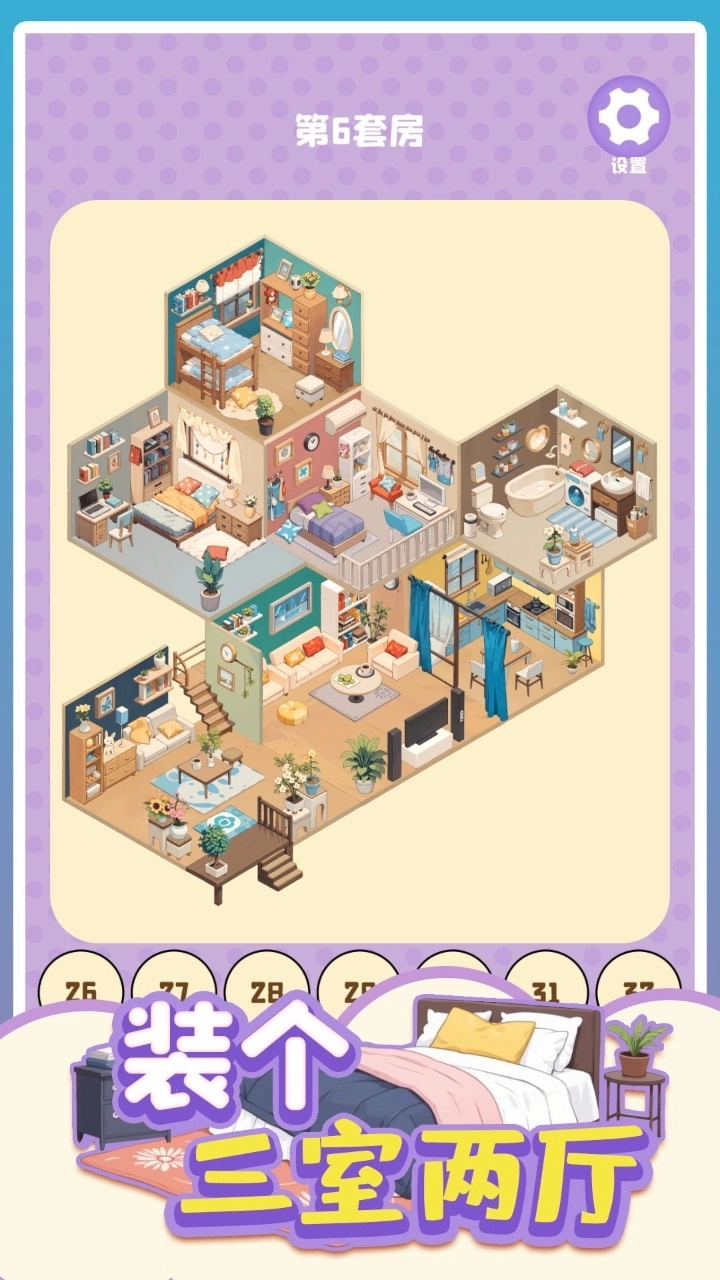 《装个三室两厅》是一款画风超萌的休闲装扮游戏。在游戏里,你需要把打包好的家具摆放进各个房间,亲手装扮属于自己的小屋。游戏采用可爱的卡通画风,还设计了十分丰富的关卡,能充分满足你对收纳与装扮的热爱。看着一间空荡荡的房间被你打造成温馨漂亮的小家,那种满满的成就感简直让人开心到飞起!赶紧来精心布置客厅和卧室,挑战一下吧!