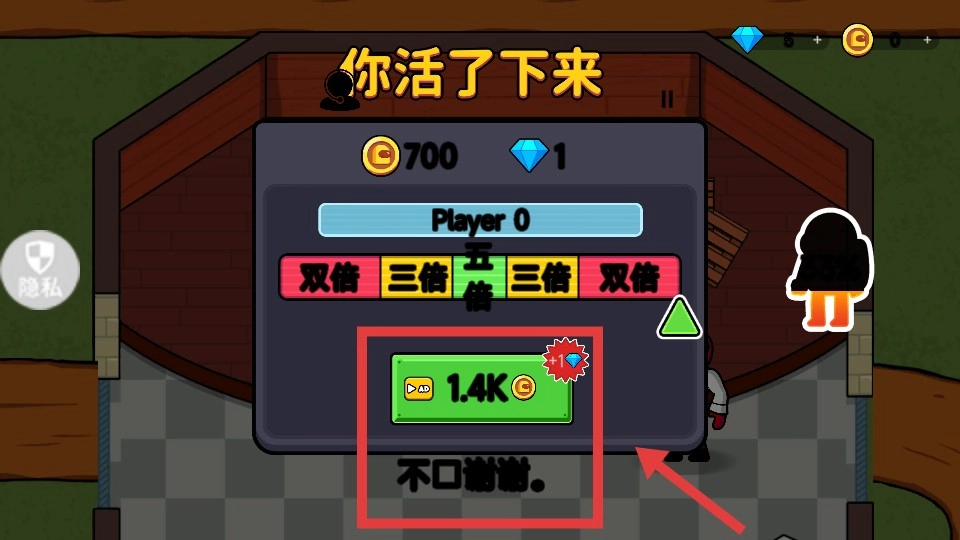 4、游戏结束后,界面会显示“你活了下来”,此时可以选择观看广告获取1.4K金币,也可以点击“不了谢谢”来完成结算。