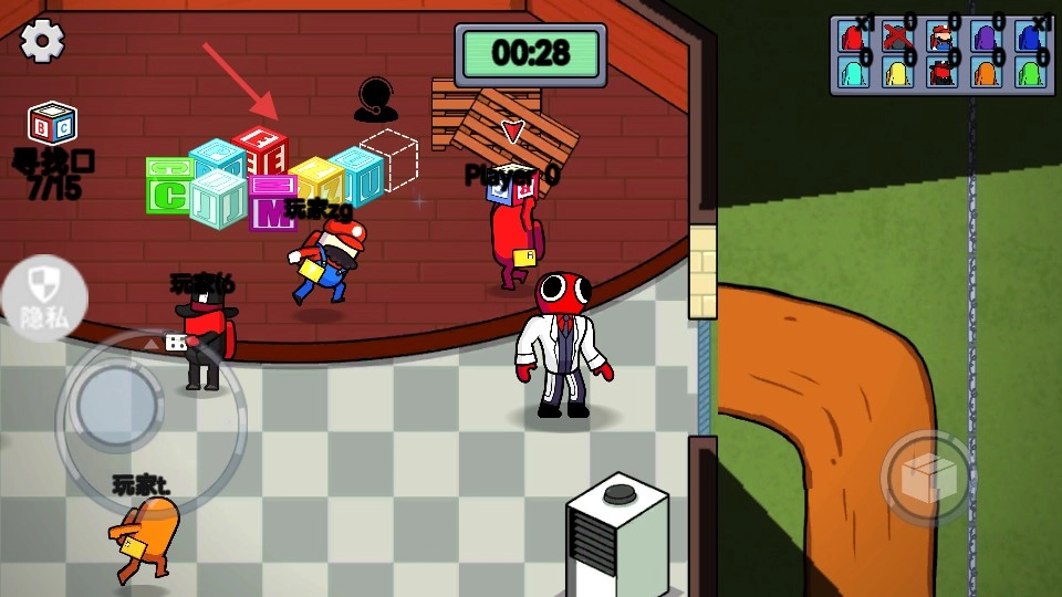2、通过左侧的方向操控盘来控制角色移动,在场景中收集带有字母标识的彩色方块。