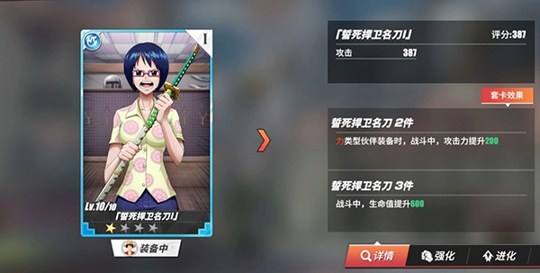 战意卡对角色战力的影响十分明显,合理搭配可以显著增强战斗表现。路飞属于力系角色,前期建议采用专属卡组“誓死捍卫名刀”。