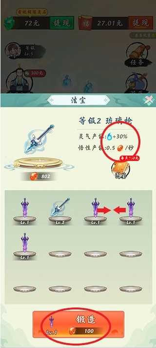 3、然后你就能锻造你的法宝道具,提升它们的属性