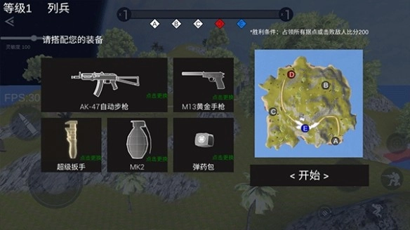 2、随后,选择关卡地图,并设置获胜比分、出生时间以及游戏难度等参数,完成后点击“开始”。