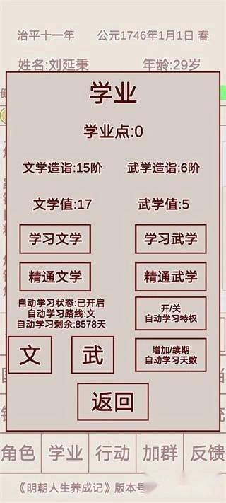 1、文官初始阶段的学业侧重文学方向,武官初始阶段的学业侧重武学方向。想要称帝需晋升至正一品官职,而晋升正一品的条件之一是其中一项造诣需达到18阶,另一项造诣也得同步提升。要是觉得手动点击学习比较繁琐,可通过观看视频开启自动学习特权,每次开启能持续30年;