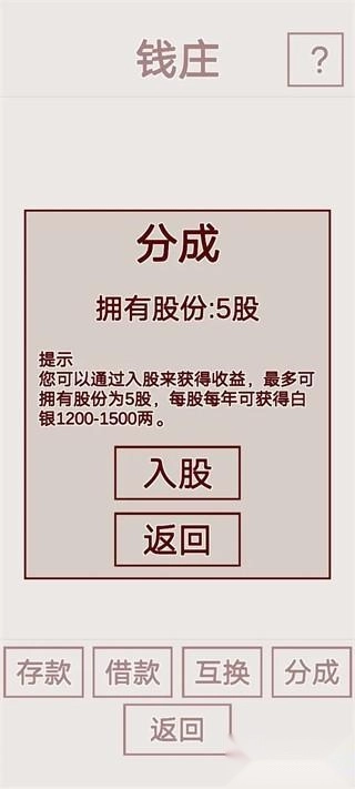 7、钱庄的分成机制为每股每年能带来1200到1500两白银的收益,入股一股需缴纳10万两白银,单个投资者最多可持有5股,持有满5股时每年收益可达6000至7500两白银,投资者可根据自身情况选择是否入股。
