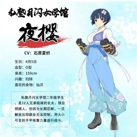 简介:夜樱是私塾月闪女学馆的二年级学生,家里有12个兄弟姐妹,她身为长女,很擅长照顾身边的人。因为平日里习惯了忍耐,所以当她压抑的情绪一旦爆发出来,就容易陷入失控的状态。她战斗时依靠的是能调节尺寸的手甲,凭借着强大的力量来展开对决。