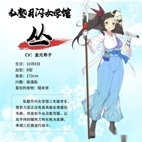 简介:丛是私塾月闪女学馆的三年级学生,尽管她一直努力想改变自己因没有面具而显得害羞的性格,却始终没能完全克服。她的武器是双手所持的锯肉刀和长枪,战斗时会带领着三匹狼一同行动。