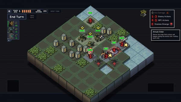 在《Into The Breach》的游戏机制里,HP其实可以看作是为了赢得胜利而能够消耗的资源。不必担心让机甲承受一些较低的伤害,为了守护人类的建筑,这么做是完全值得的。另外要注意的是,机甲的HP降到0并不意味着它彻底损坏,只是暂时失去行动能力而已。要是有被动技能能够治疗它们,这些机甲就会在没有飞行员的情况下重新启动并继续参与战斗。损失“机师”(Pilot)或许会让你心里不太舒服,但这并不会导致游戏直接“结束”。就算某次任务失败了,你也可以把其中一名机师传送回另一条时间线,而且这名机师所积累的所有经验以及已经解锁的能力都会被保留下来。所以,“培养—保护—继承”王牌机师就成了游戏中的核心战略。由于每次只允许传送回一名机师,那么小队里的另外两位机师基本上就可以被当作“易耗品”来使用了。