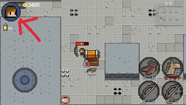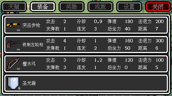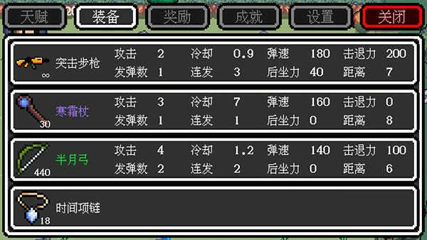 15、界面右下角设有四个武器框,其中三个用于装备各类武器,而左上角的那个框则是专门放置特殊道具的(当前游戏内可获取的特殊道具仅有圣光盾、时间项链和疾风靴)