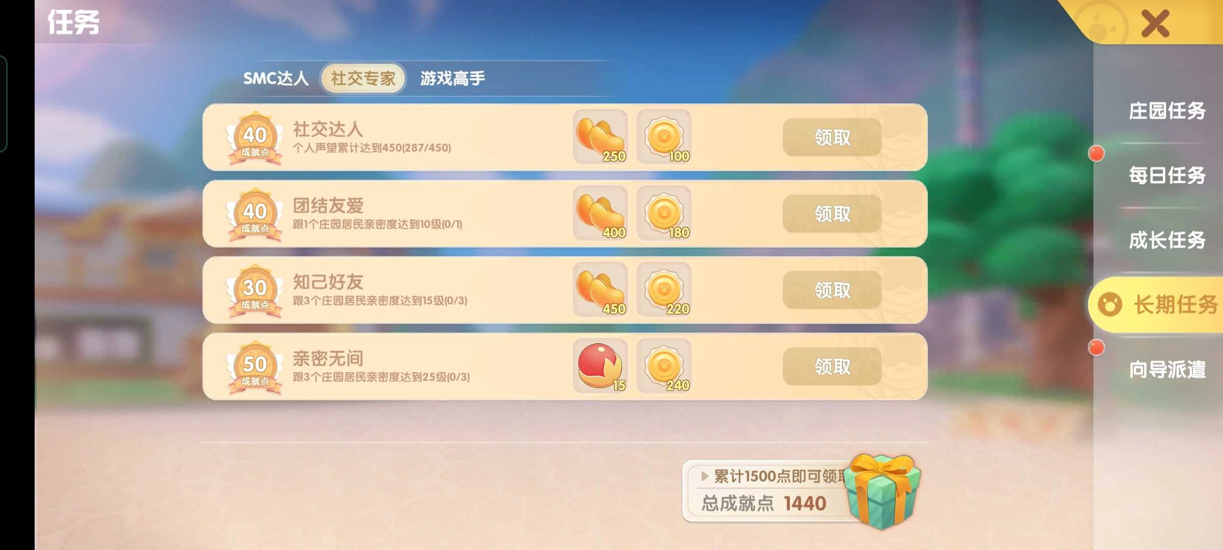 长期任务可划分为三个小类别,SMC达人相关的任务大多属于成就类,需要玩家稍微投入一些时间和精力去完成。