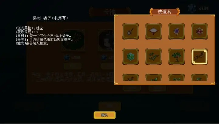 [道具属性]:法宝@[获取等级]:1@[果树]:每一个回合会产出1个橘子。@[果实]:可以给角色添加3%吸血概率。@[触发]准备阶段触发。