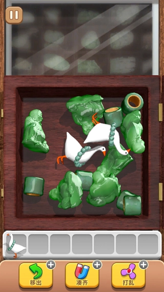 3、点击抓大鹅进入游戏,第一关难度较低,只需找出三个相同的物品并放置到下方的格子里,就能成功消除这三个物品,当所有物品都被消除后即可通关。