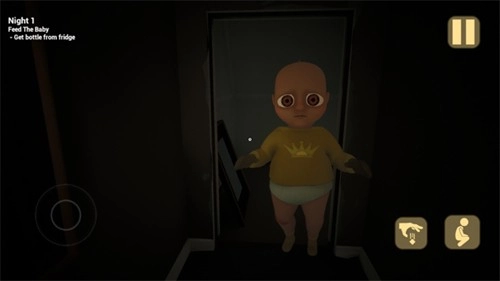 4、游戏操作方面,左边的按键用于控制角色移动,右边的按键则是抓取功能,右上角设有暂停按钮。现在你需要朝着前方的婴儿走去并将他抱起。