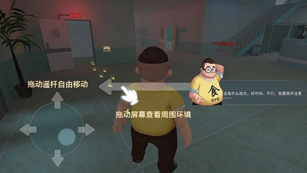 3、首次加载场景,在旁白的介绍中,你将来到陌生环境,在这里会有操作提示,如拖动摇杆自由移动,拖动屏幕查看四周环境。