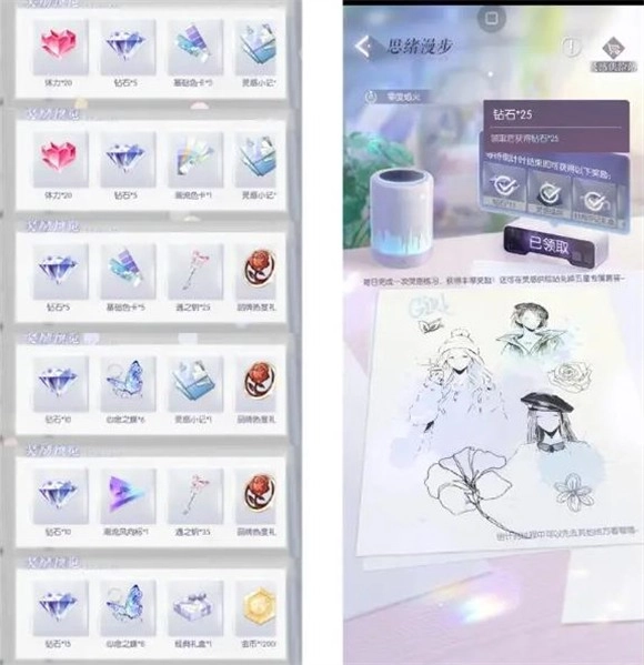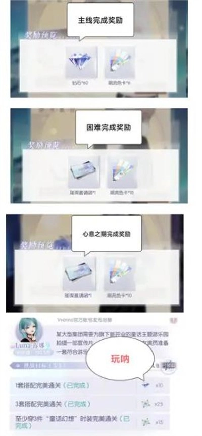 3、主线相关奖励:普通主线通关9次可获得60钻;困难主线通关9次能得到一张璀璨邀请函;心意之期通关6次可获取一张璀璨邀请函;玩呐每个小节通关奖励10钻。