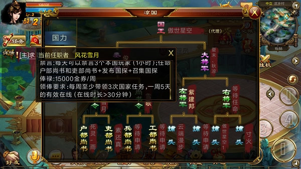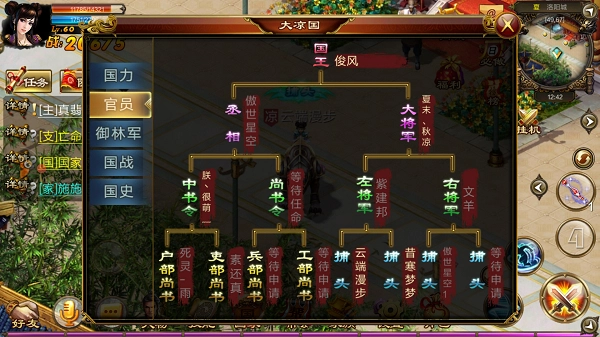 游戏内所有国家官员均由玩家担任,六国各自设有如下官员体系: