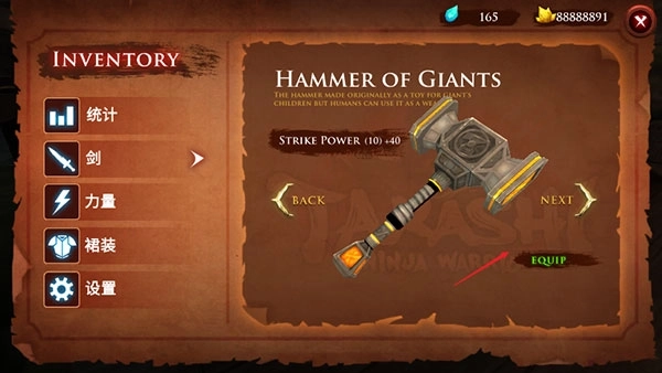 4、点击右上角的暂停菜单后,就能查看剑、力量、裙装这些配饰的详细介绍,点击EQUIP按钮即可更换新的武器和裙装。