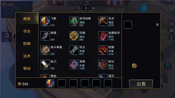 5、左侧金币所在的位置可用于购买装备,各类装备的功能存在差异,玩家需依据战局情况来选购。