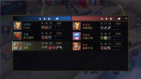 7、在右侧中间区域能看到己方和敌方的战绩,也可以给队友发送消息;