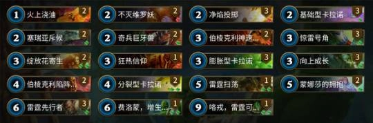 这套卡牌里,2费和3费的卡占了一半以上,这样在实战中不容易卡手,整体运转起来很顺畅。具体操作时,前期要尽量摸到2费生物,跟着费用节奏下怪,再通过buff让它们以强欺弱。中期则用各类优质生物持续保持压制,一旦场面占优就转向打脸,同时得留意防范对手的AOE。通常到8、9费阶段,就能自然压垮对手;要是伤害还不够,就靠各种冲锋卡牌来终结比赛。