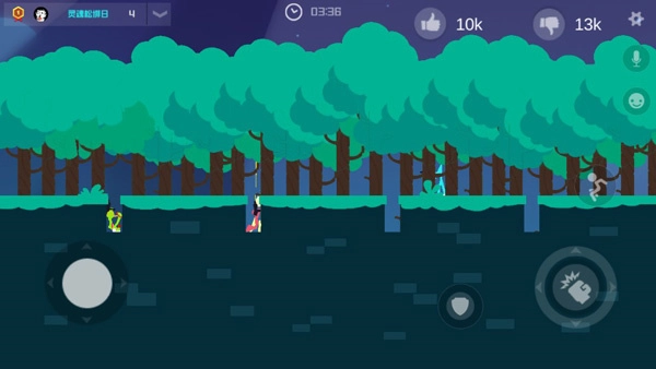 左下角的虚拟摇杆可操控角色移动,右侧则设有跳跃、攻击、防御等按键。