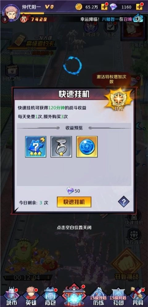 5、玩家进入游戏一段时间后,可领取挂机奖励。